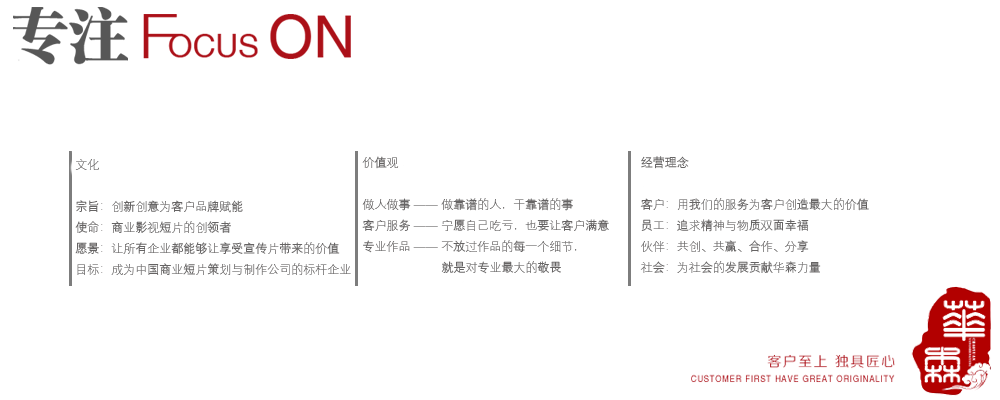 秉承“客戶為上”的原則,以市場(chǎng)為導(dǎo)向,以“視頻營(yíng)銷戰(zhàn)略”為教程,讓每一部影片的作用發(fā)揮到極致。
